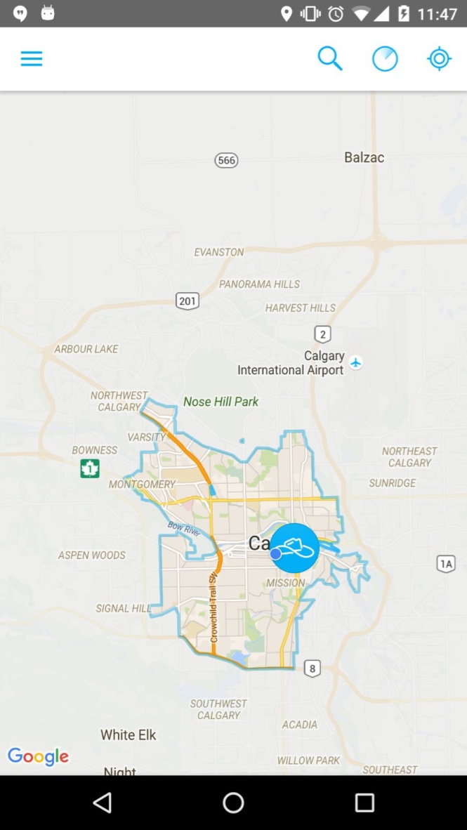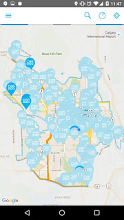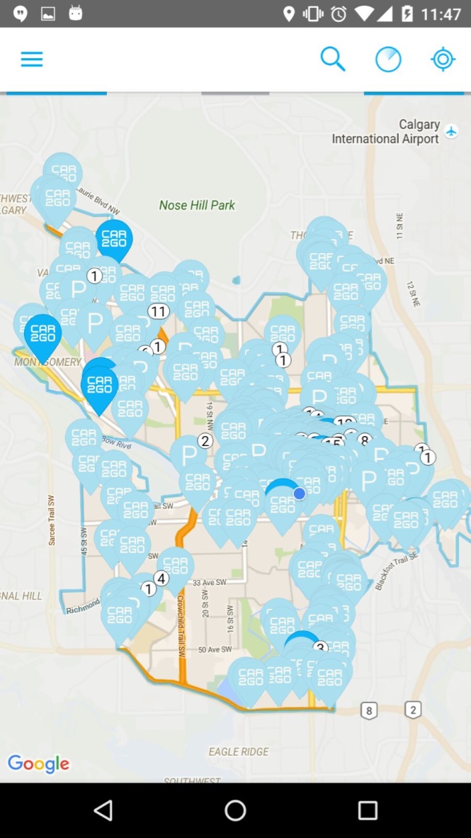 Existe uma área delimitada pra você poder estacionar o Car2Go dentro da cidade. Aqui em Calgary, esse limite é perto de um dos shoppings e envolve praticamente todos os bairros do centro. Eu tirei um print do aplicativo pra vocês entenderem. Esses balões são os carros disponíveis no mapa (os azuis mais fortes são as mercedes).
