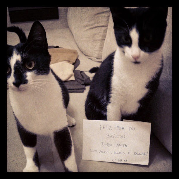 Na hora de decidir os nomes, ela também participou. Queríamos nomes de vilões. Pensamos em Darth e Vader. Fernando achou difícil pra Bibi, nossa afilhada falar (ela ainda era pequenina). Ele deu a ideia de BISCOITO E NABISCO, LAJOTA E CALOTA e mais uns que eu não lembro, mas que eram igualmente horríveis hahaha Pensamos então nos vilões de seriado: Dexter e Klaus. Vilões malvados mas que nós amávamos.