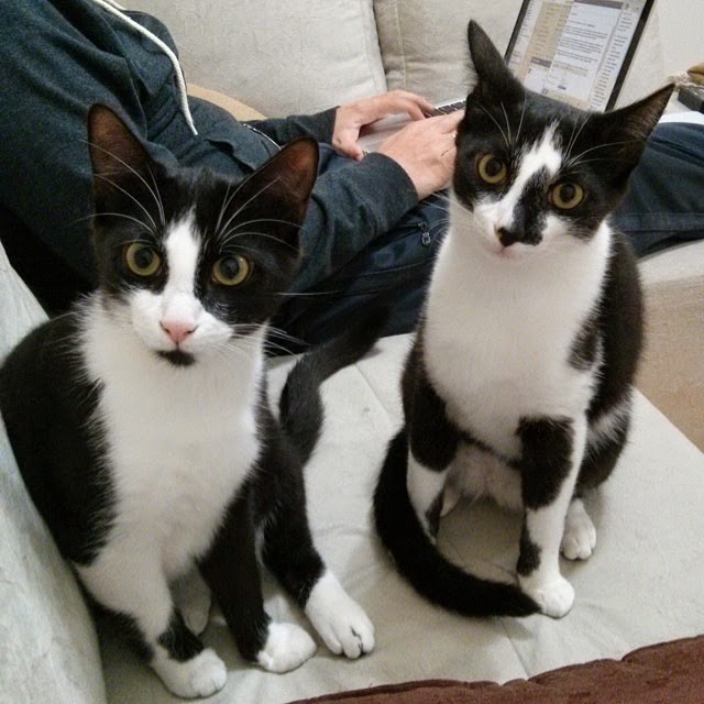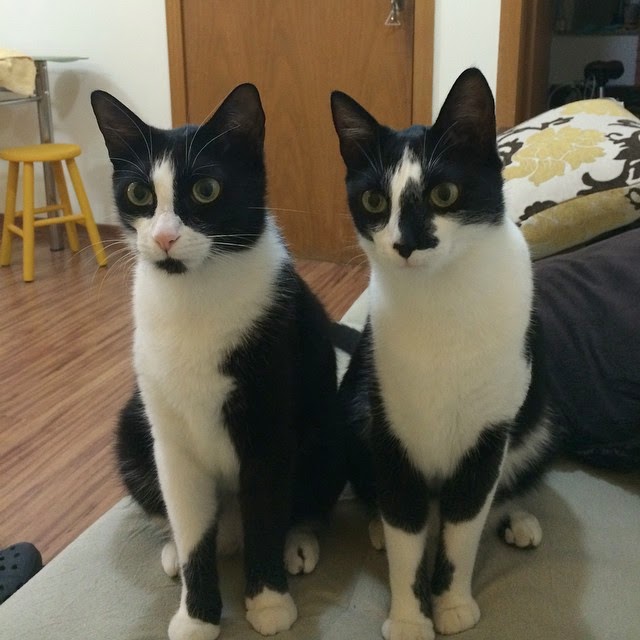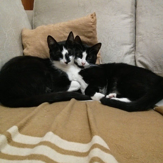 Eles ganharam nomes assim porque esperávamos dois gatos monstrinhos iguais a Heleninha. Eles parecem dois bobalhões de tão dóceis que são.