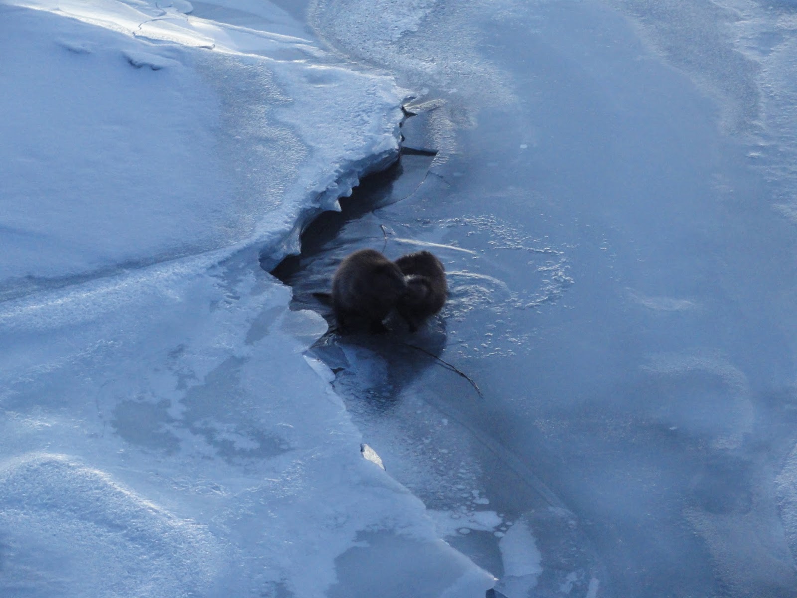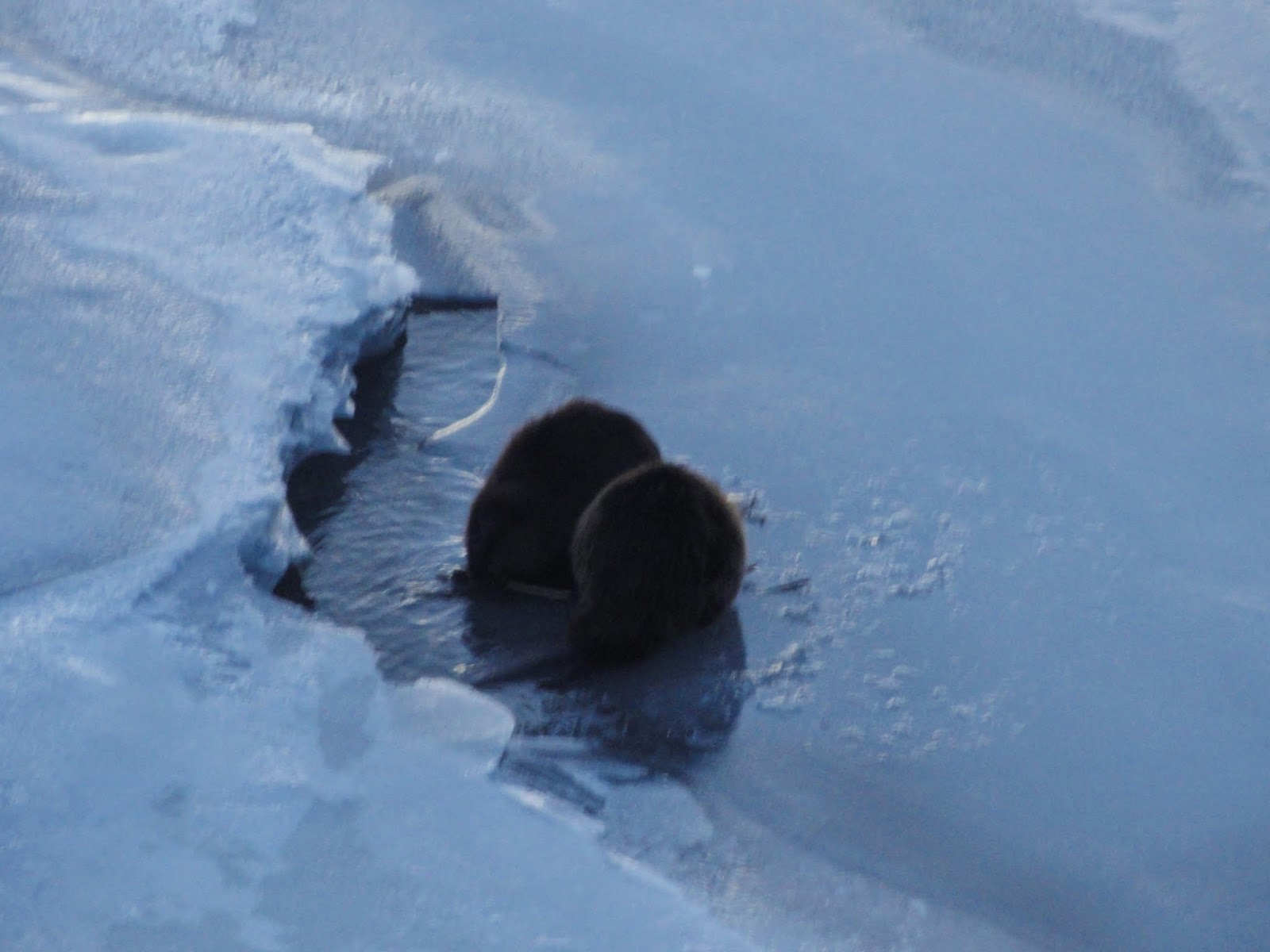 Castores: Eles entram pra dentro da parte congelada do rio e ficam brincando com os galhos.